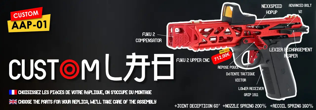 Le Custom Lab BDU-Airsoft propose des AAP-01 entièrement customisés, montés et testés par un joueur expérimenté. Chaque réplique est assemblée manuellement avec des pièces sélectionnées pour leur compatibilité, puis réglée avec précision (hop-up, cycle, constance).